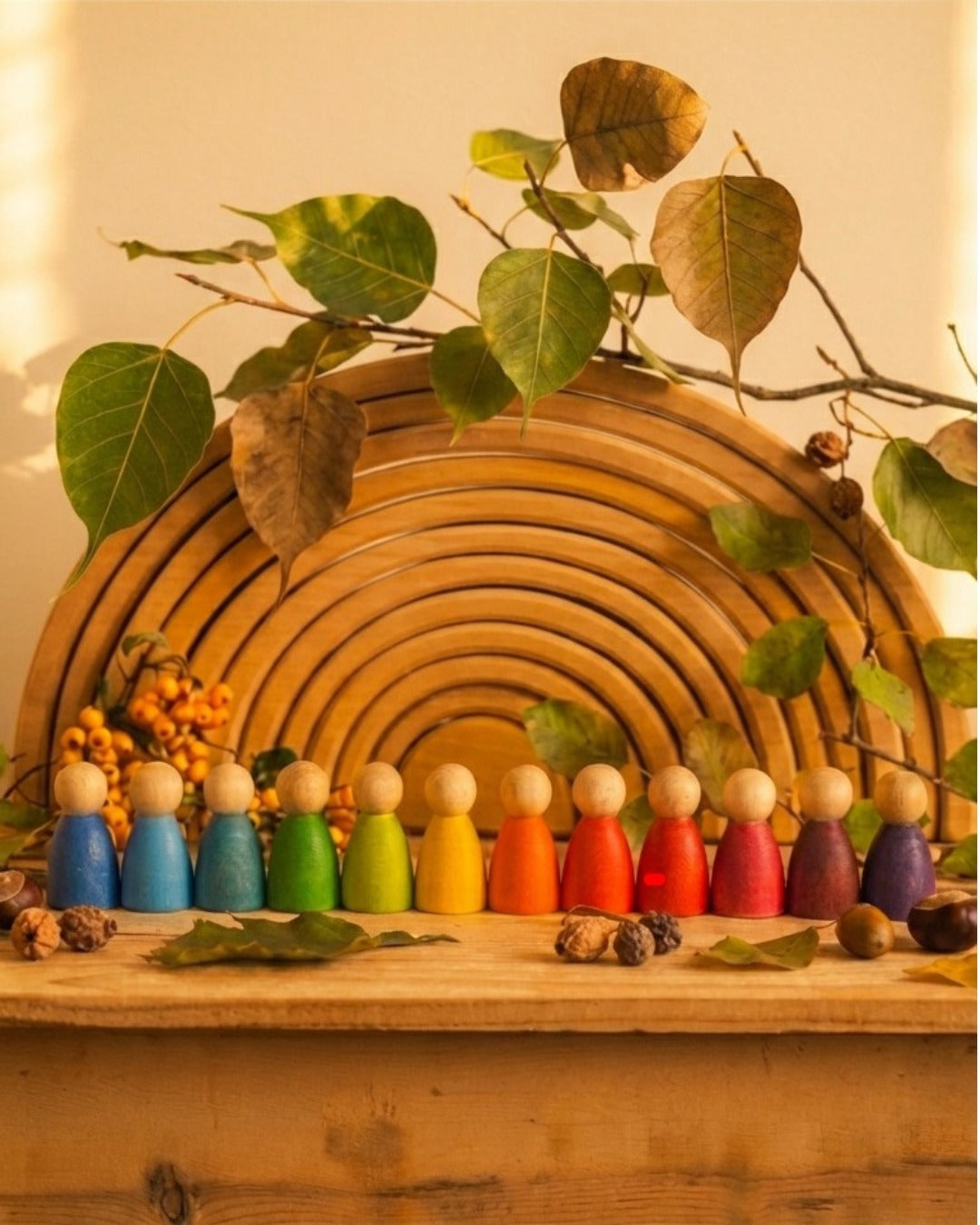 12 wooden rainbow dolls painted in a rainbow of colors. You can simply let your children play freely with these beautiful figures or use them for learning colors, counting, ordering, and so on and also social interaction, kindness, and relationships. There are 12 friends that can be used to represent the 12 months of the year too. You can style and decorate them with a cloth and natural materials or simply leave them plain and let your imagination do the rest. Made from European Beechwood and hand-painted with nontoxic paints. Each set of dolls is unique and full of natural beauty. Steiner educators will love how these wooden dolls with their simplistic features can be used in a myriad of ways of creative, natural play.